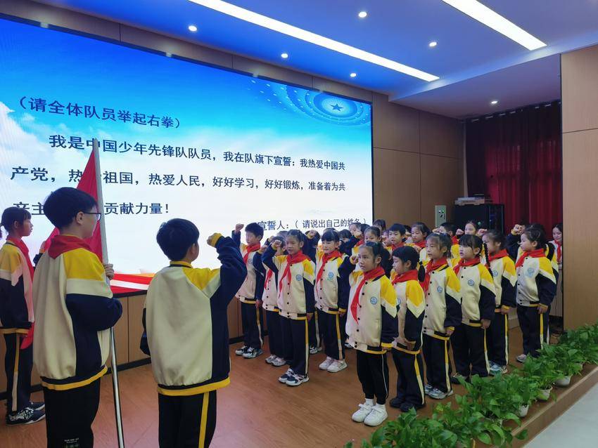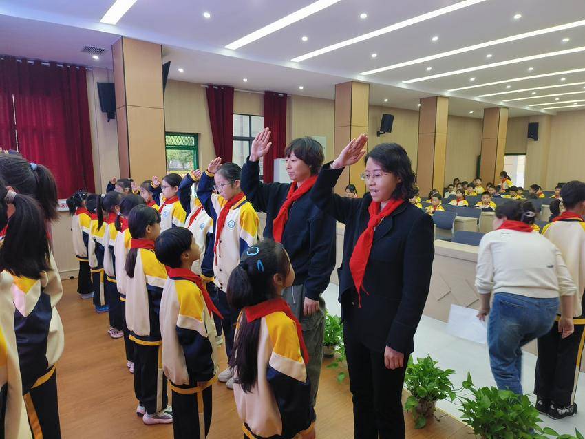 在大队长的带领下,新队员们举起右拳,在队旗下进行了庄严的宣誓。“我是中国少年先锋队队员,我在队旗下宣誓……”坚定的誓言在校园上空回荡,每一句都充满了力量,表达了他们为红领巾增光添彩的坚定决心。