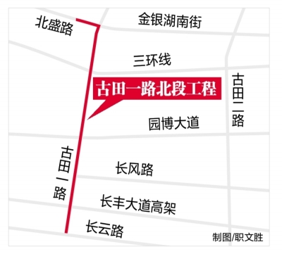 古田一路北段工程(长云路—金银湖南街)全长2786米,南起硚口区,北至东西湖区,是汉口西部地区重要的南北向交通要道,是完善武汉“环射成网、循环连通”路网体系的关键工程。该工程采用“主线高架+地面辅道”设计,其中高架桥桥宽17米至37.5米,双向4至8车道。