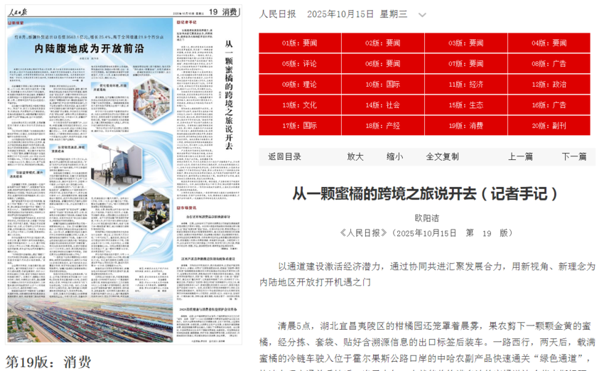 清晨5点,湖北宜昌夷陵区的柑橘园还笼罩着晨雾,果农剪下一颗颗金黄的蜜橘,经分拣、套袋、贴好含溯源信息的出口标签后装车。一路西行,两天后,载满蜜橘的冷链车驶入位于霍尔果斯公路口岸的中哈农副产品快速通关“绿色通道”,快速办理完通关手续后,当天中午12点就能将饱满多汁的蜜橘送达哈萨克斯坦阿拉木图分拨中心。
