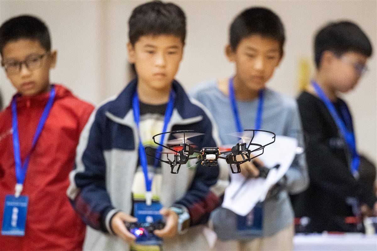 10月18日,小选手们操作无人机进行“编程无人机”比赛。(湖北日报全媒记者 任勇 摄)