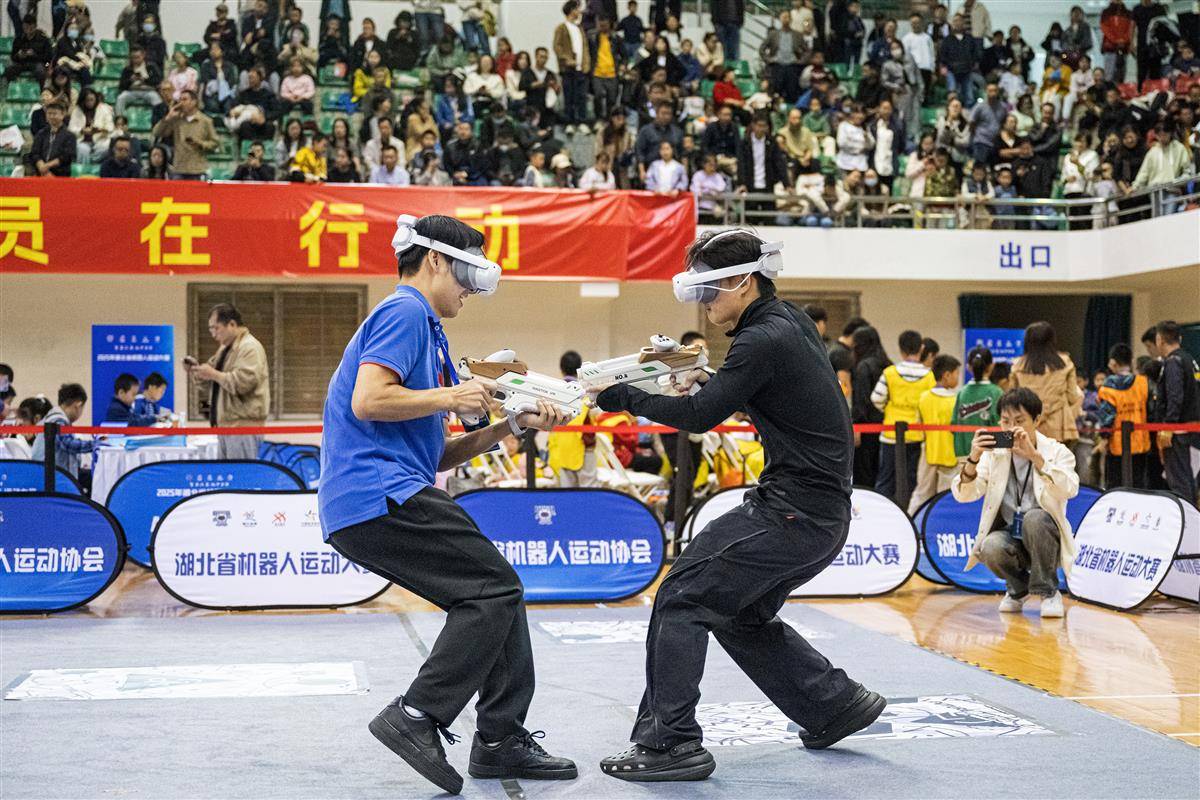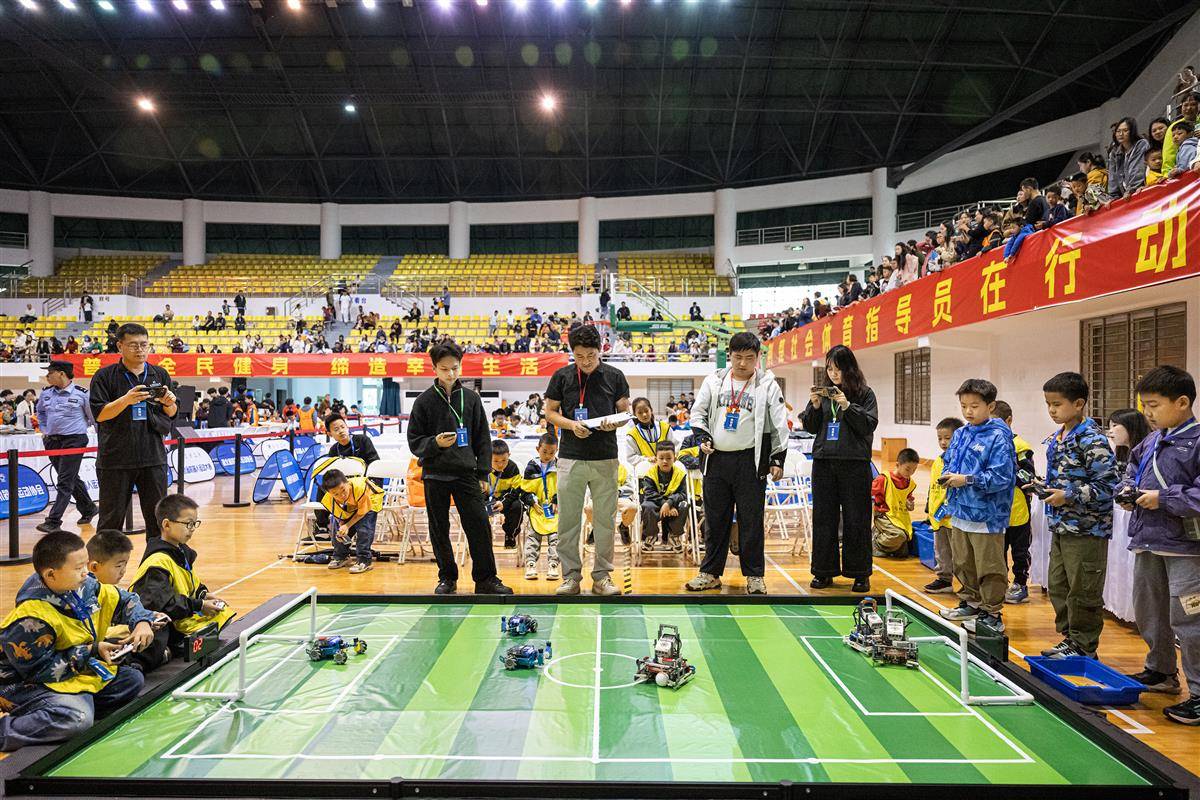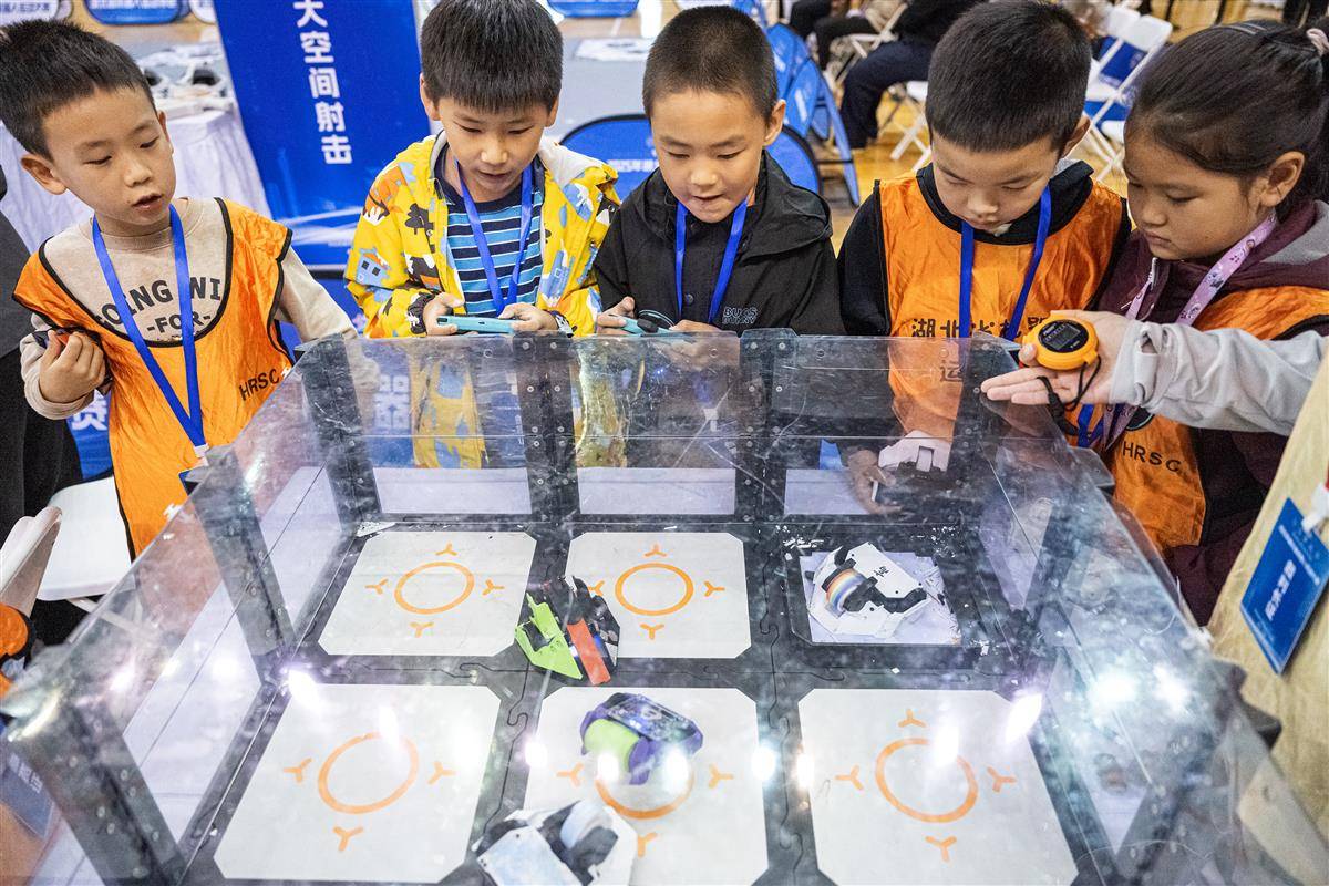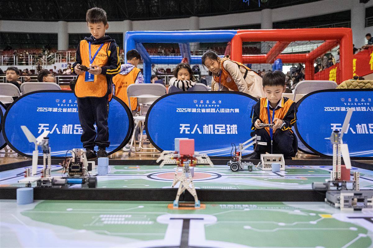 据悉,这是连续第五年举办的湖北省机器人运动大赛。今年的比赛设陆地机器人、空中机器人、虚拟机器人3个大类,涵盖机器人足球赛、AR硬件挑战赛、编程无人机等19个赛项。每个项目分设少儿组、少年组、青年组和成年组,为不同年龄段的青少年提供了展示创新能力的舞台。(湖北日报全媒记者 任勇 摄)