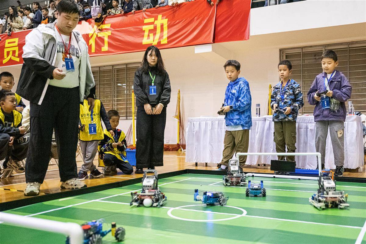 10月18日,小选手们操作“机械战士”进行“机器人足球赛”。(湖北日报全媒记者 任勇 摄)