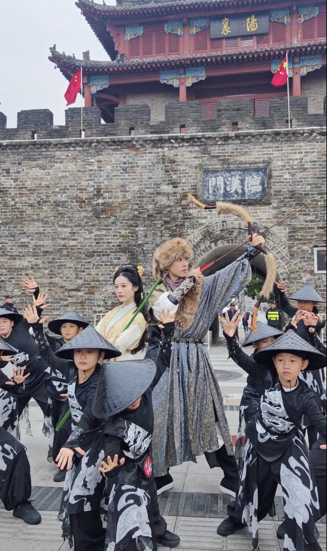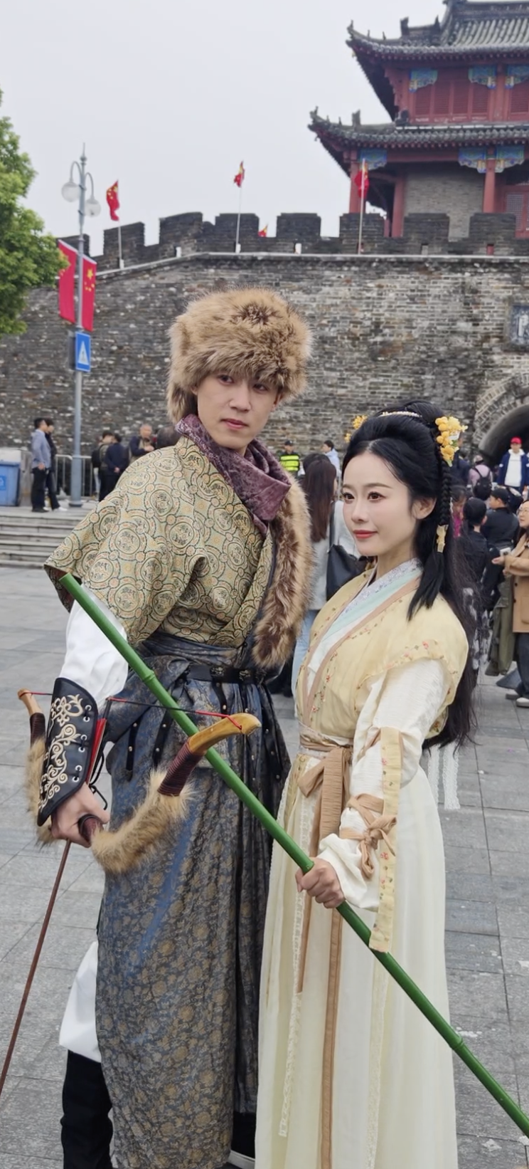 10月19日,襄阳马拉松现场,郭靖、黄蓉装扮的演员为运动员呐喊加油。2025年襄阳马拉松以“侠义襄阳”为主题,结合金庸小说元素打造沉浸式赛事体验,黄蓉、郭靖等经典形象深度参与赛事宣传与文旅推广。(湖北日报全媒记者 柯皓 摄)