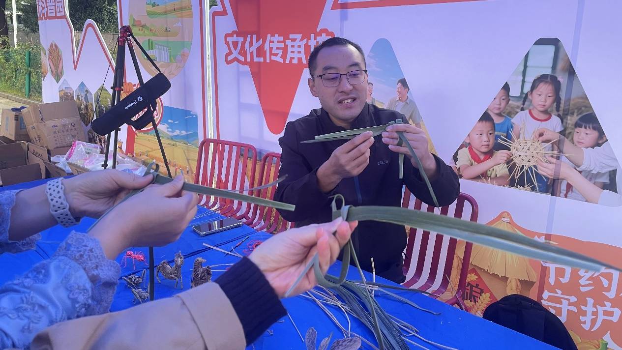 在文化传承坊,草编技艺传承人巧手翻飞,将平凡的稻草变为栩栩如生的艺术品。众多家长与孩子在此沉浸于“一粒米、一束草”的故事中,亲手编织稻草小鱼,感悟农耕文明的智慧与粮食的来之不易。