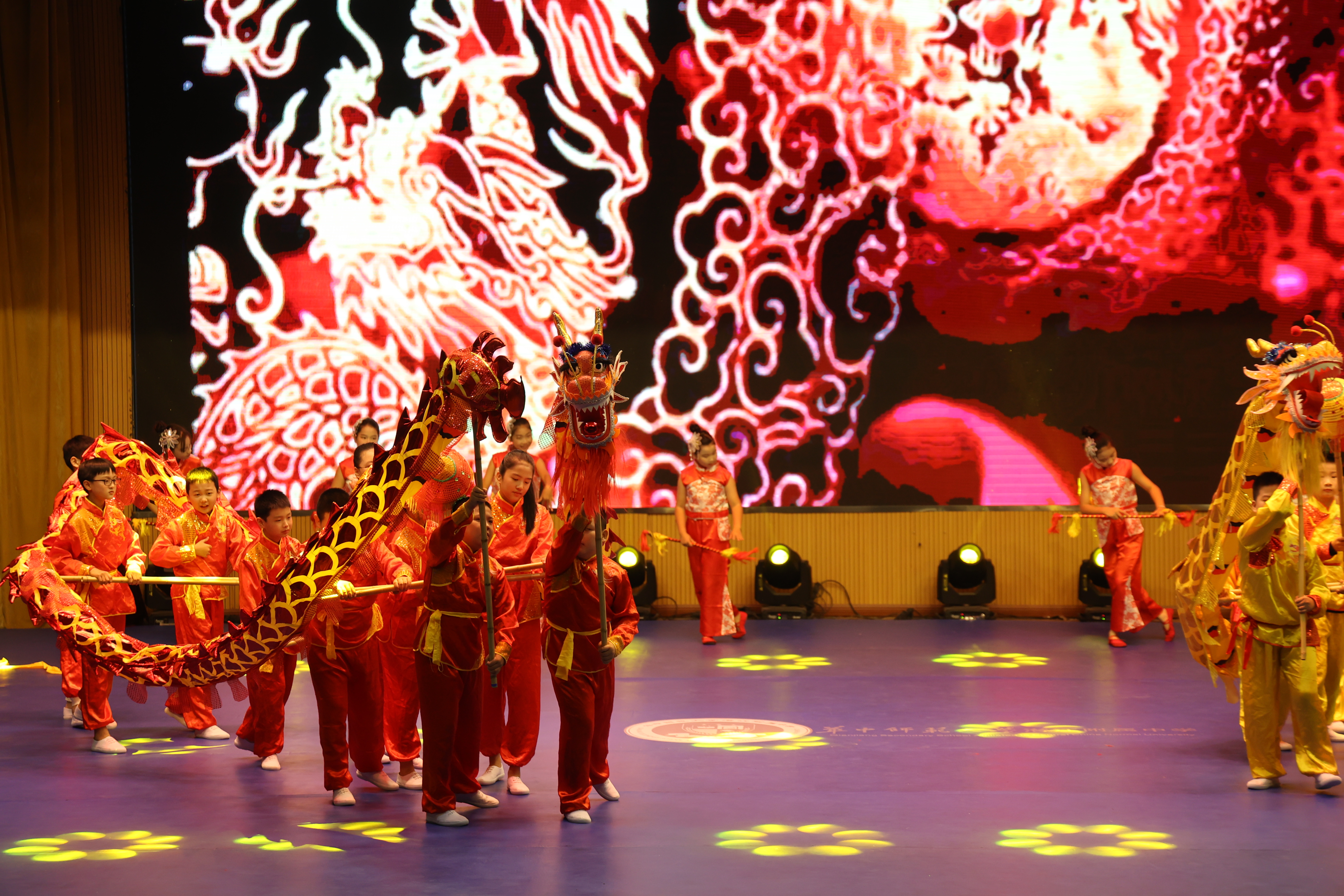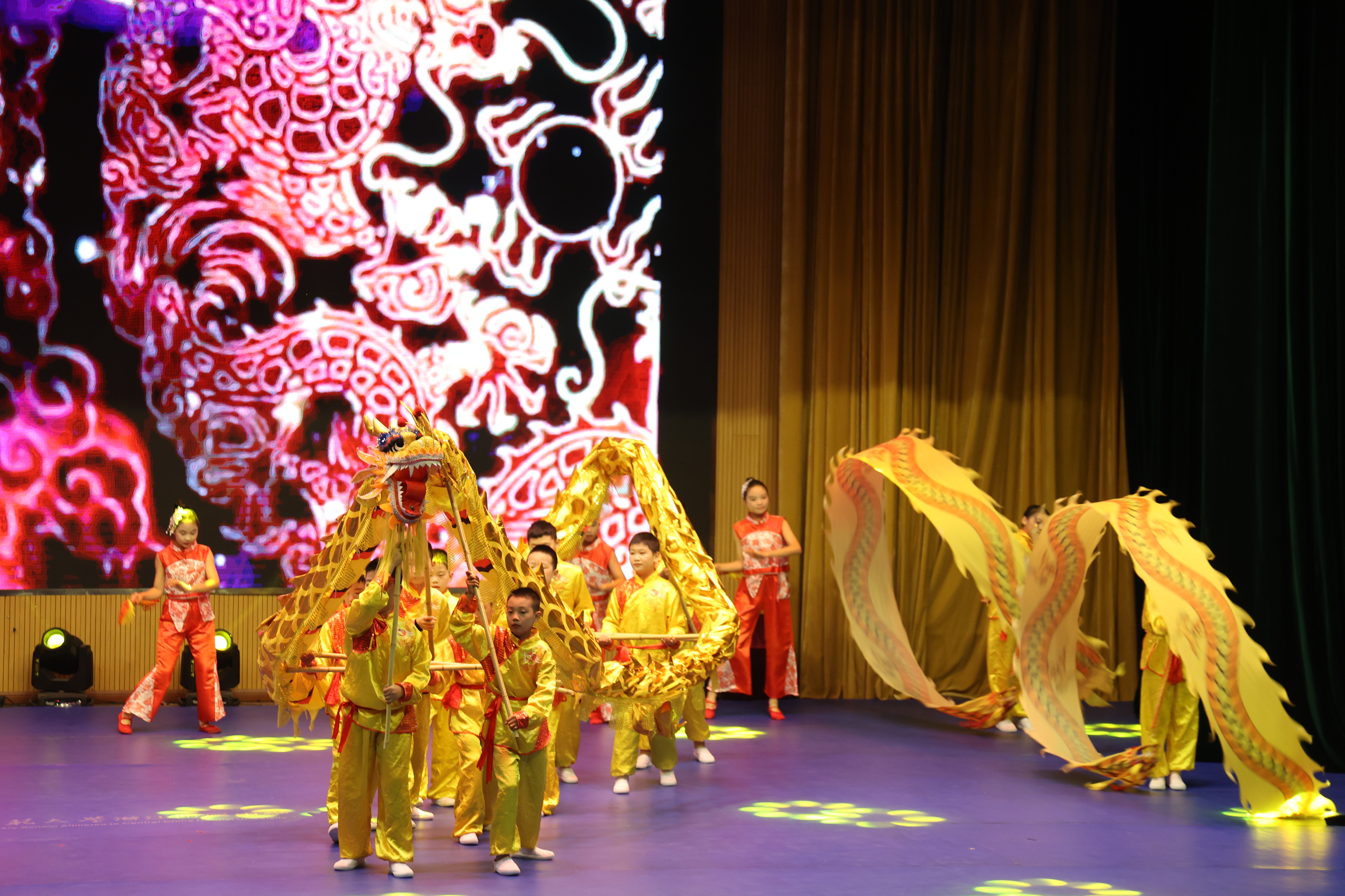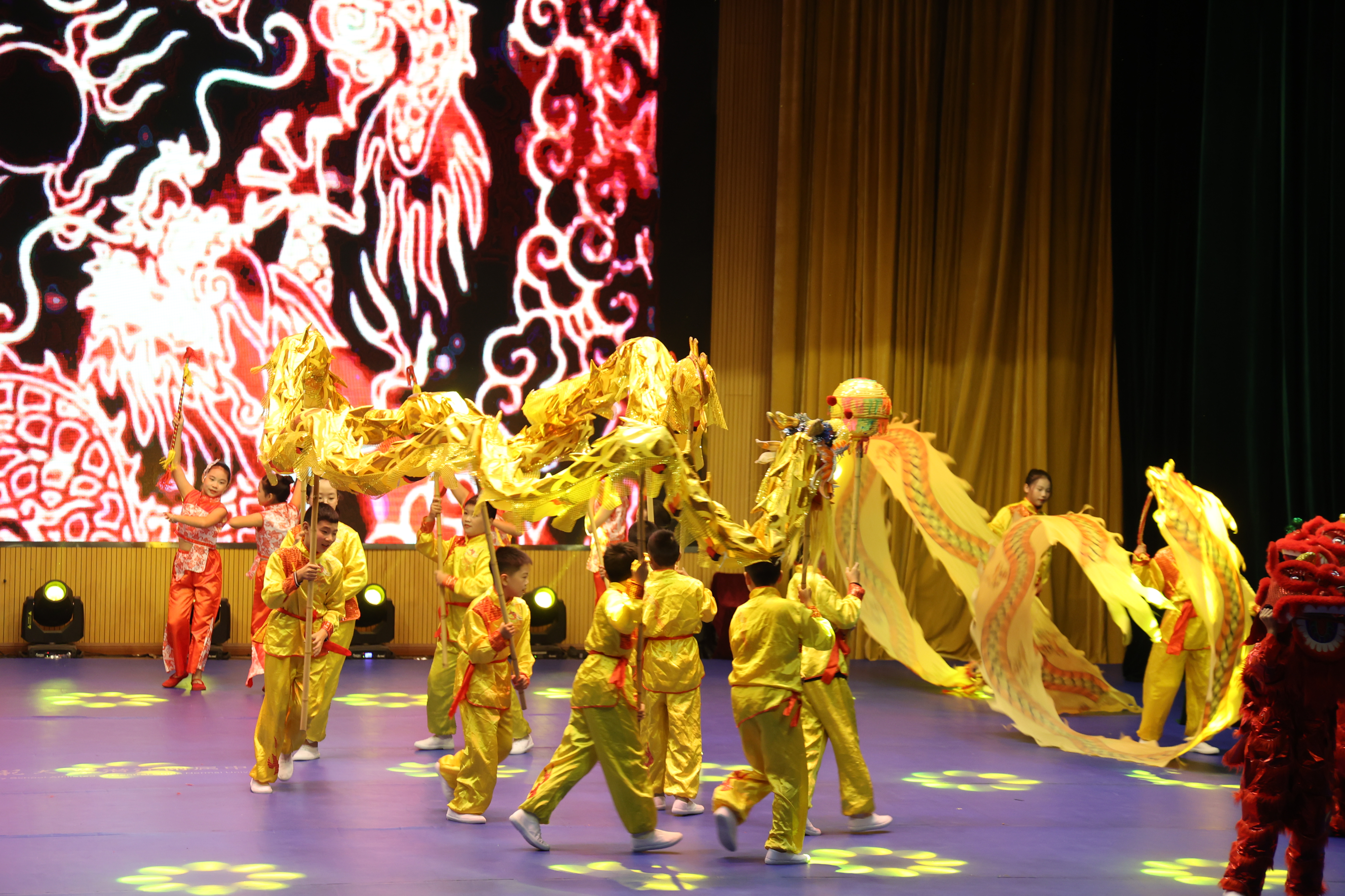跟随浩口镇第三小学学子们矫健的步伐,暖场节目《祥龙绕场 莲厢幻彩》正式登场,小小舞龙手们默契配合,操控着“祥龙”盘旋、翻滚。另一边,手持莲厢的学生们跟着节拍舞动,清脆的“嗒嗒”声与鼓点呼应,将打莲厢的灵动展现得淋漓尽致。随后,校园集体操《青春》、情景歌舞剧《祖国赠予我的》等节目陆续上演。