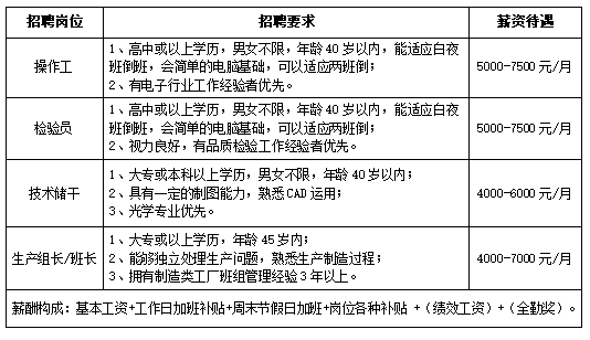 岗位要求:18-42岁,高中以上学历;有一年以上制造业工作经验,化工类优先考虑;身体健康、吃苦耐劳、服从管理,接受倒班作业。