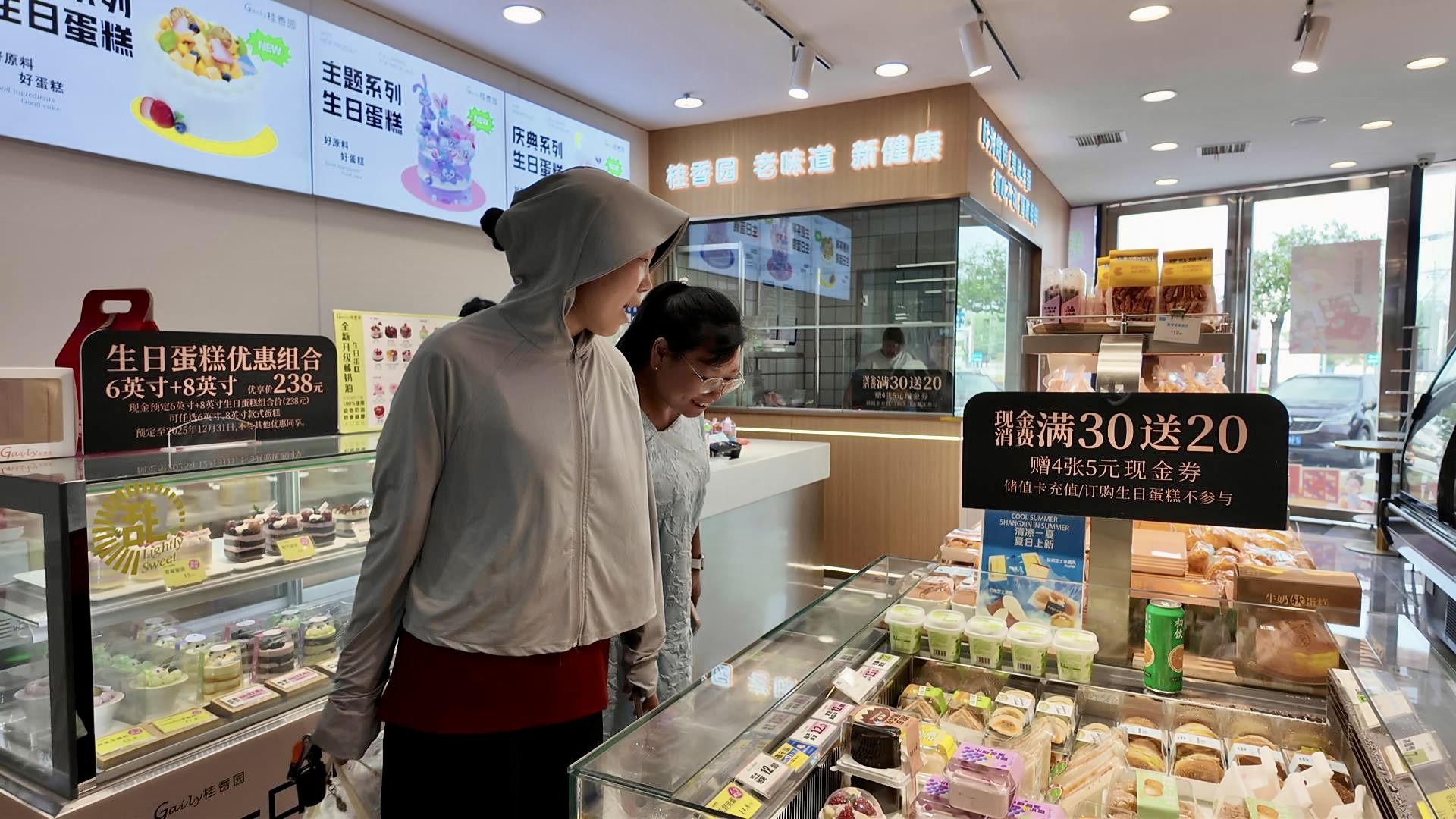 中午十二点,新装开业的桂香园安福寺店内人流不断。刚出炉的面包被整齐地摆进柜台,店内弥漫着浓郁的面包香气,吸引着市民们驻足挑选。“我是桂香园的老顾客了,最喜欢吃桂香园的面包,今天看到又有新蛋糕、新面包,特地来买一点。”市民冉思雨告诉记者。