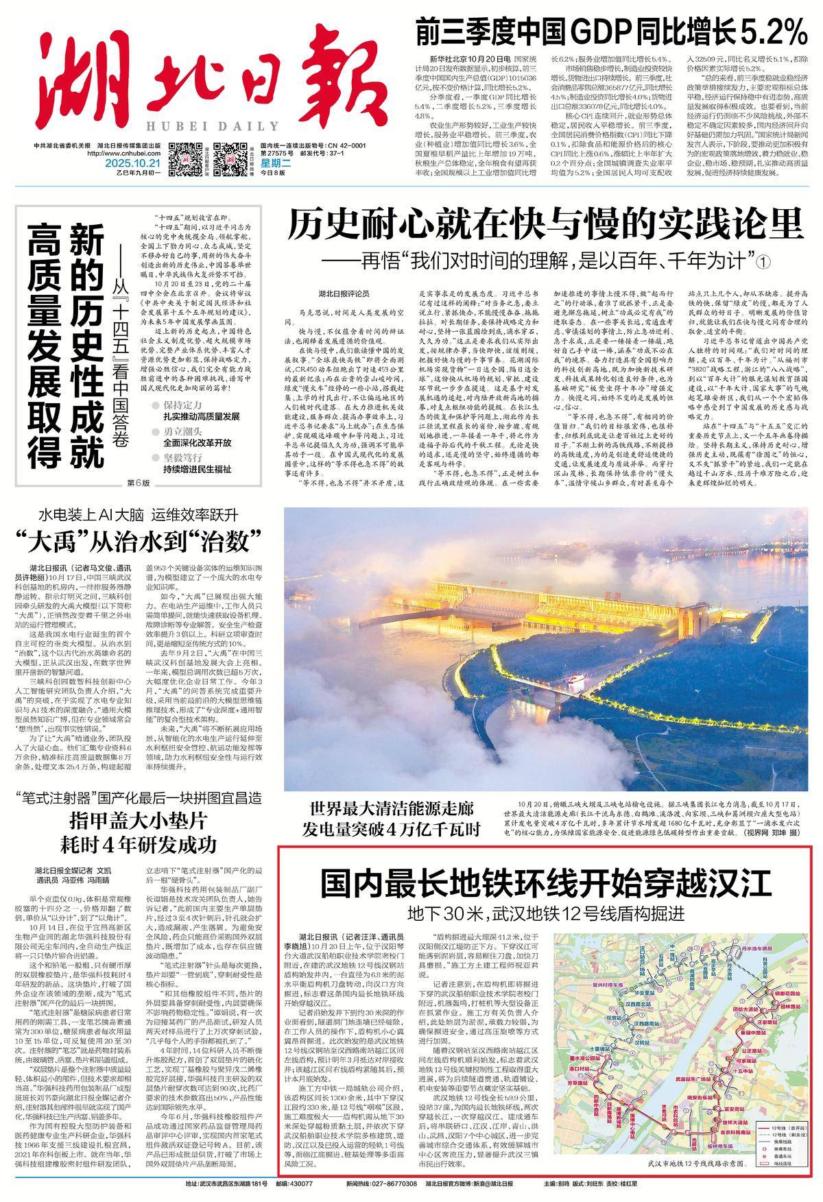 10月21日,湖北日报头版报道:国内最长地铁环线开始穿越汉江