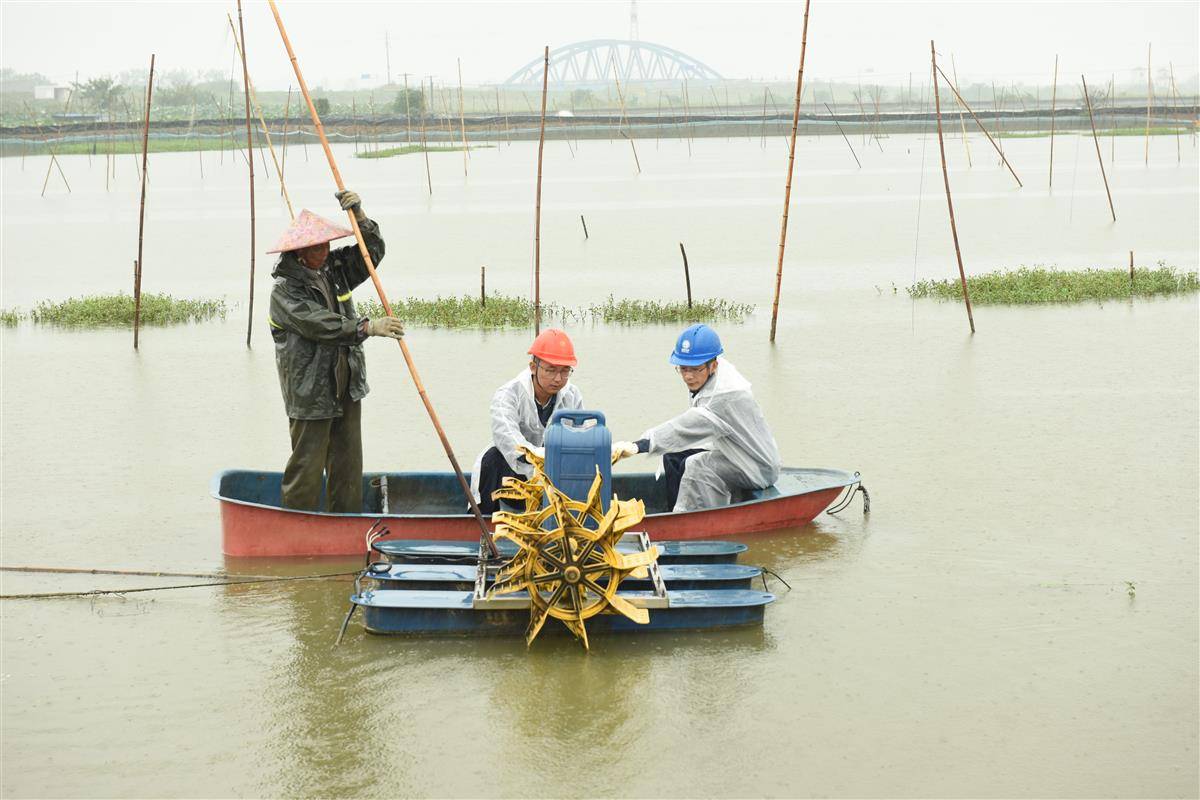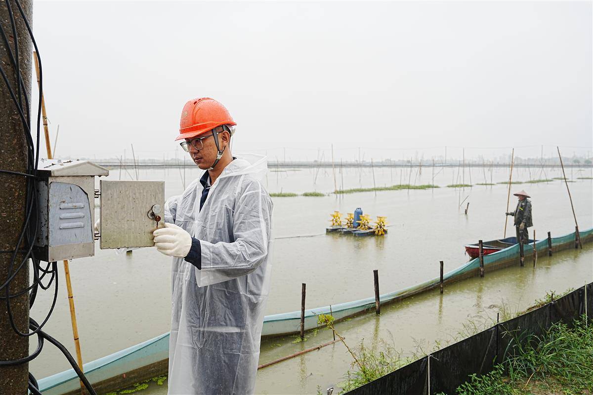 供电员工检查鄂州市梁子湖蟹农的增氧机运行状况