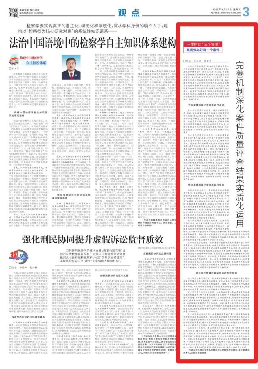 湖北日报客户端讯 当前,案件质量检查评查已成为优化检察管理的重要抓手。8月27日,《检察日报》第03版观点刊发了宜昌市葛洲坝人民检察院检察长杨娟、案管负责人徐小波和检察官助理黄梦月共同撰写的《完善机制深化案件质量评查结果实质化运用》调研文章。