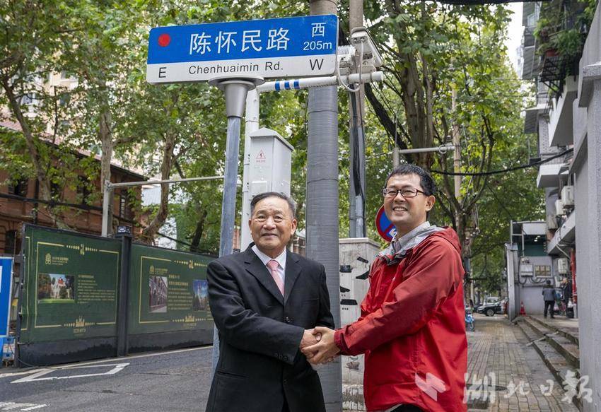 陈德(左)和小林拓也在陈怀民路路牌前合影
