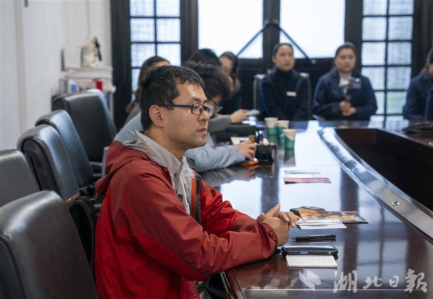 八路军武汉办事处旧址纪念馆,日本《赤旗报》驻京记者小林拓也(右一)采访中国空军烈士陈怀民的侄子陈德(左一)、纪念馆工作人员和武汉民间收藏家