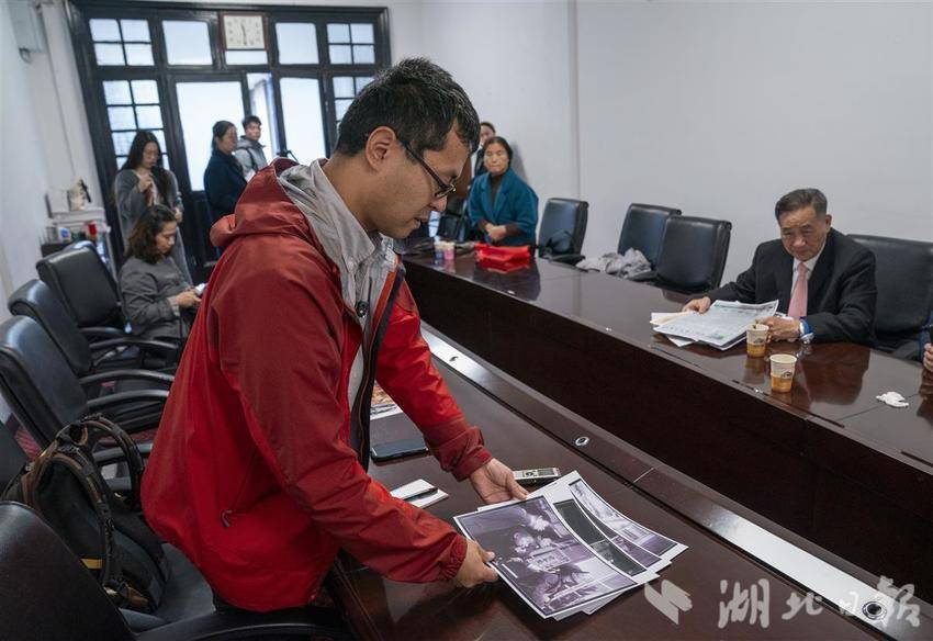 《赤旗报》记者小林拓也仔细观看外国记者在武汉拍摄的抗战历史照片
