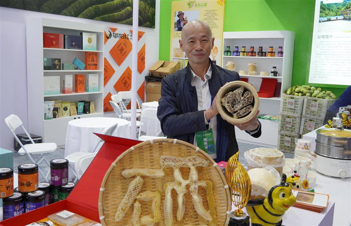 在鹤峰县的展区,一个由巢蜜拼摆的“硒”字吸引了众多参观者的注意。“这个造型是蜜蜂历时180多天制作而成的,不仅具有观赏价值,也有蜜蜂文化科普教育价值。”湖北鹤峰源汁蜜蜂业开发有限公司负责人喻明国已参加过多届硒博会,在2023年第八届硒博会上,其公司名下农场申报的含硒中蜂蜜荣获“恩施十大富硒土特产”的称号。