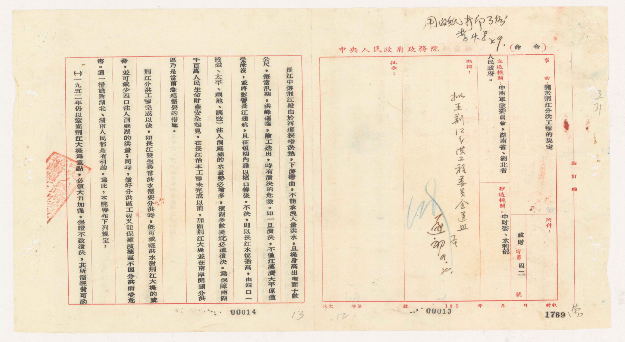 中央人民政府政务院《关于荆江分洪工程的规定》(湖北省档案馆藏)