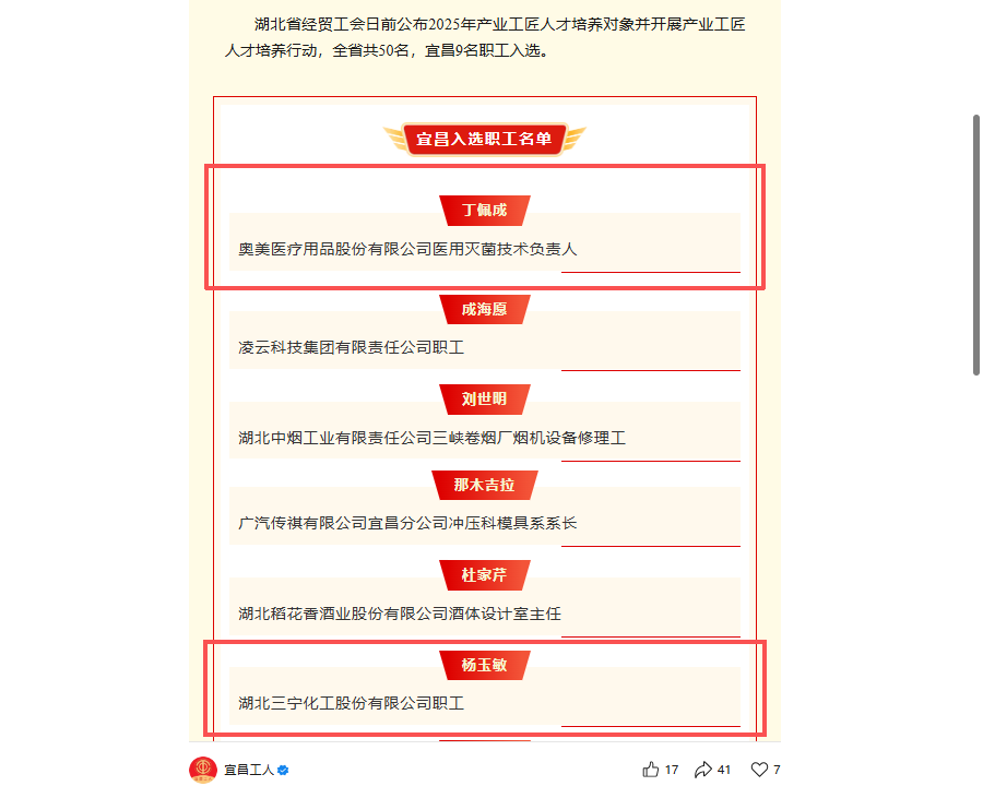 杨玉敏和丁佩成的成功入选,为枝江市广大产业工人树立了榜样,他们的事迹表明,在平凡岗位上心怀匠心、精益求精,同样能创造不凡业绩,实现自我价值并助力社会进步。未来,枝江市将持续加强技能人才培养,弘扬工匠精神,为“枝江制造”迈向“枝江智造”提供坚实人才支撑,为全省发展贡献更多枝江力量。
