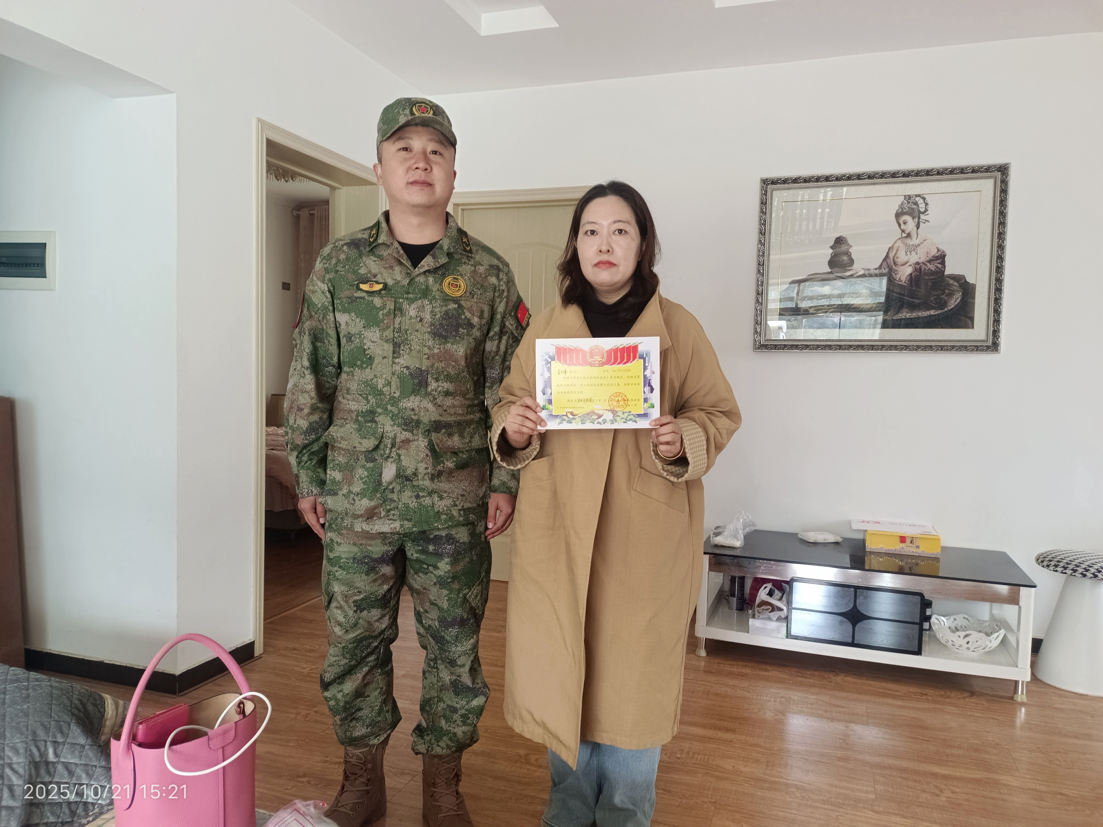 湖北日报客户端讯(通讯员易剑平)10月21日,夷陵区雾渡河镇人民武装部联合退役军人服务站工作人员组成服务小队,深入辖区各村(社区),为即将入伍的新兵家庭上门送达《入伍通知书》,并悬挂“参军光荣”牌匾,将党和政府的关怀与荣光送到新兵及家属心坎上。