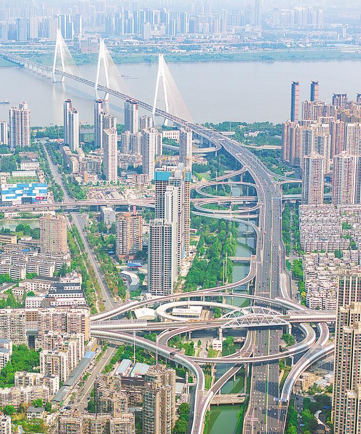 鸟瞰武汉二环北洋桥西路至二七长江大桥路段。长约2公里的二环线高架桥,与罗家港互通立交、和平大道立交、二七长江大桥临江大道上下匝道相连接,与桥下的罗家港河以及跨河桥编织成城市立体交通网,奏响都市磅礴发展乐章。(湖北日报全媒记者 朱熙勇 摄)