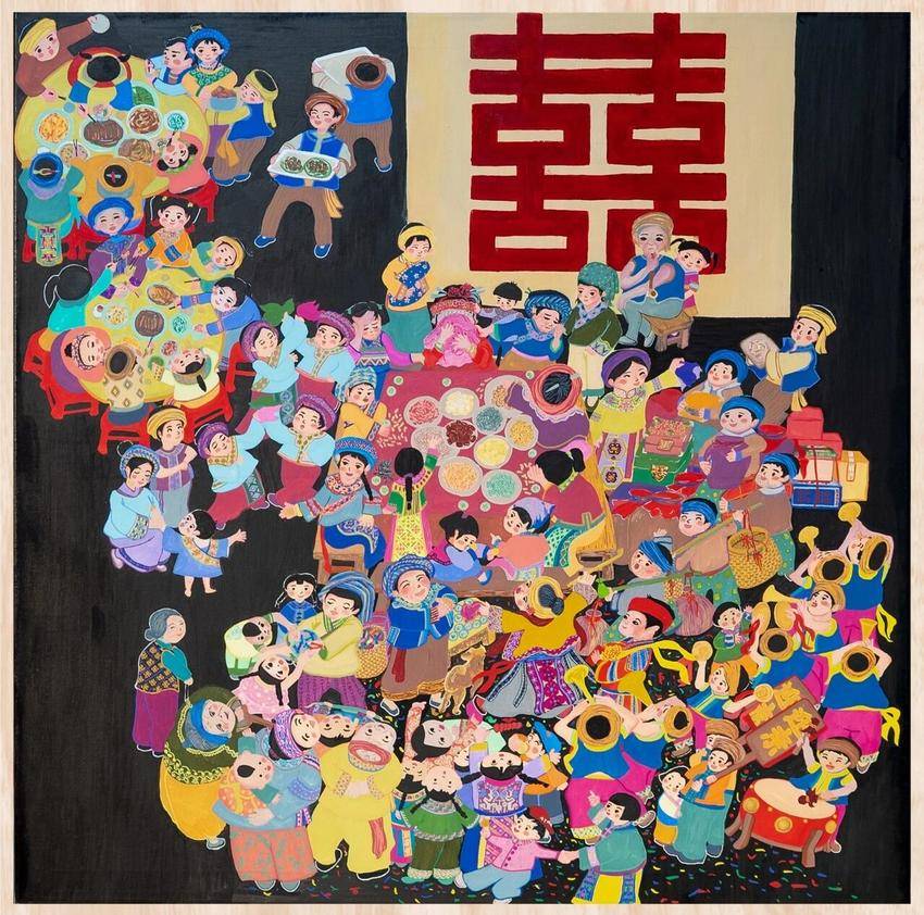 基层文化破壁的根基,是对本土文脉的“考古式挖掘”与“艺术化转译”。《贺新歌》的感染力,正来自对土家文化元素的精准捕捉与重构。“十碗八扣”暗藏“待客以诚”的哲学,银饰纹样既是非遗传承也隐喻美好生活,“哭嫁”情态转化为跨地域审美共鸣。这些元素借婚礼主线串联,既保农民画质朴,又融年画意趣,成功让土家文化从“小众记忆”变为“大众感知”。