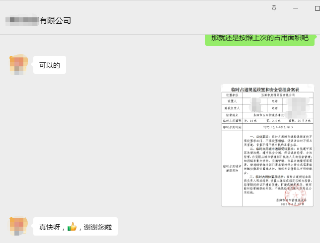 当日上午,市民陈先生因业务推广需要申请临时占道备案。通过线上渠道联系城管部门后,在工作人员指引下,通过线上方式提交了申请材料。城管局工作人员第一时间响应,进行线上审核,短时间内即完成了备案流程,并通过网络向陈先生反馈了电子备案结果,实现了全流程“不见面”审批。陈先生对此表示:“现在办理业务真是太快了!连门都不用出,省去了专门跑窗口的时间,三分钟就搞定了!省时省力又省心!”