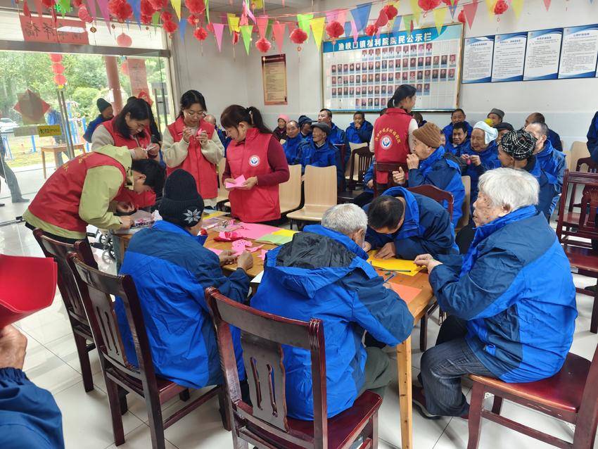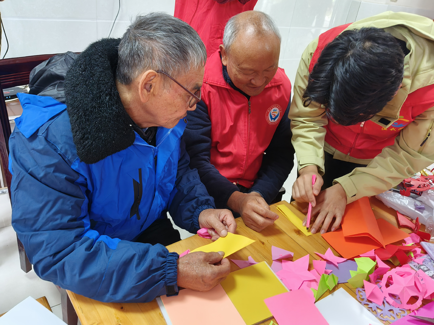 在剪纸环节,志愿者耐心引导,老人们从折纸到裁剪,一步步学习剪纸技巧。“好看,我要把这个贴在房间里!”一位老人举起自己的作品,开心地对身旁的志愿者说道。