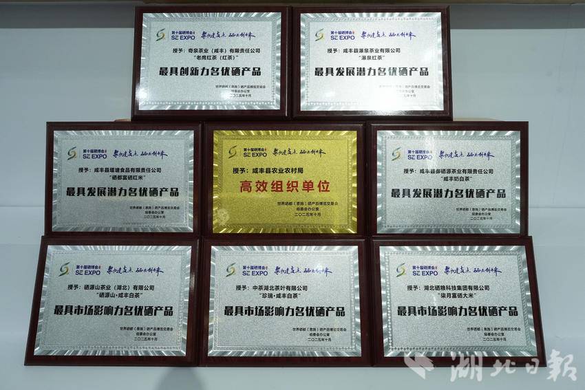 获奖的具体情况是,咸丰县硒源山茶业(湖北)有限公司选送的硒源山咸丰白茶、中茶湖北茶叶有限公司选送的珍瑞咸丰白茶、湖北硒粮科技集团有限公司选送的柒月富硒大米获评最具市场影响力名优硒产品;奇泉茶业(咸丰)有限责任公司选送的老鹰红茶获评最具创新力名优硒产品;咸丰县瀑泉茶业有限公司选送的瀑泉红茶、咸丰县御硒源茶业有限责任公司选送的咸丰奶白茶、咸丰县堰塘食品有限责任公司选送的硒都富硒红米获评最具发展潜力名优硒产品。