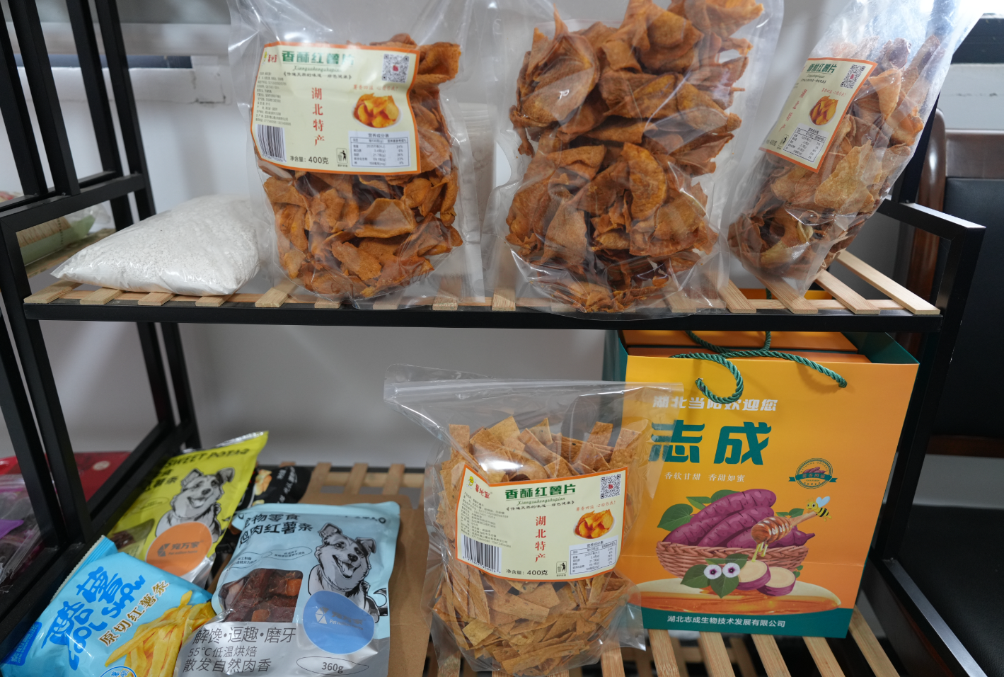 10月21日,当阳市王店镇志成生物科技有限公司仓库里,几十名当地农民正在熟练地将红薯削皮、切条。隔壁车间里,浸泡、蒸煮、糖化、烘干……现代化流水线全速运转,香甜气息扑面而来。几个小时前还是其貌不扬的“土疙瘩”,此刻已经变成金灿灿的宠物食品,即将发往日韩和欧洲市场。