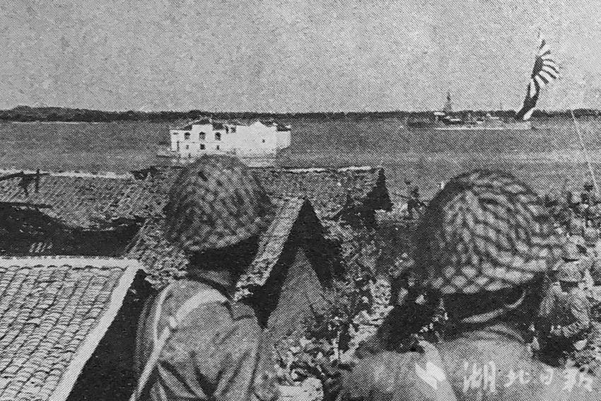 1938年武汉会战期间,侵华日军在在湖北鄂城(现湖北鄂州)长江边远眺长江中心的鄂州观音阁,画面右侧近处,一面象征着日本帝国主义的太阳旗十分醒目,画面远处江面是一艘巡弋江面的日本军舰。【图片由湖北日报全媒记者何宇欣扫描自日本于昭和十三年(1938年)十一月二十日印刷的世界画报】