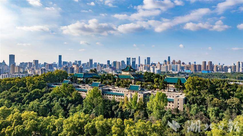 2025年10月22日,武汉大学早期建筑群被绿树环绕,背后是武汉的“城市天际线”(湖北日报全媒记者 何宇欣 摄)