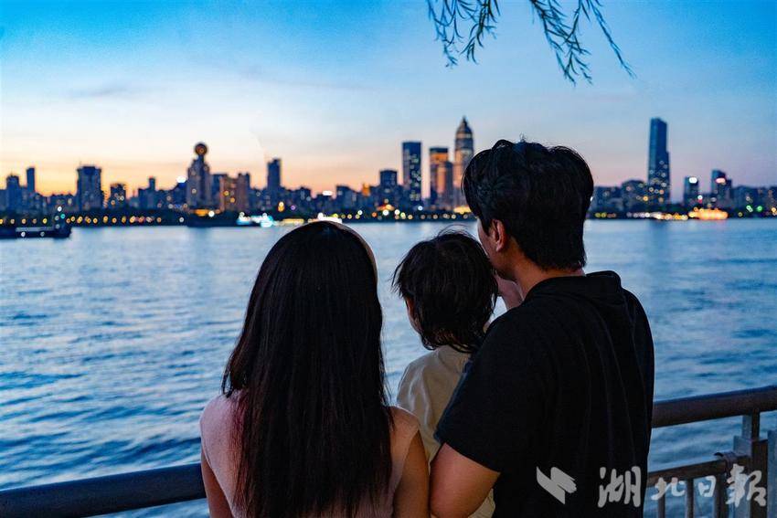 2025年8月22日傍晚,武汉市民一家三口在武昌江滩公园远眺华灯初上的汉口城区。(湖北日报全媒记者 何宇欣 摄)