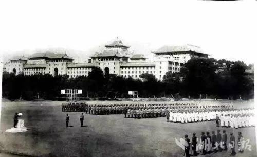 1938年武汉沦陷后,侵华日军在武汉大学操场进行队列操演,背后是武汉大学老斋舍、老图书馆等武大早期建筑群。(湖北日报全媒记者 何宇欣 扫描)