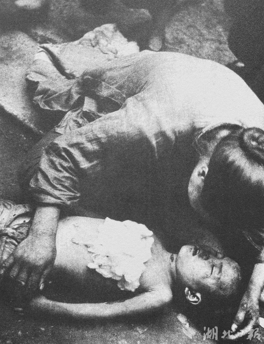 被日机炸死的武汉儿童,母亲在旁痛哭。(湖北日报全媒记者 何宇欣 翻拍于八路军武汉办事处旧址纪念馆)