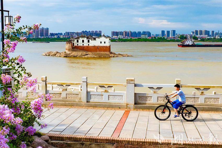 2025年8月1日,湖北鄂州,孩子骑着自行车经过花开正盛的长江江滩,背后的观音阁依旧巍然屹立,远处的黄冈市区大片高楼拔地而起,江面上航行的是川流不息的货轮,一副生机勃勃的景象印入眼帘。(湖北日报全媒记者 何宇欣 摄)