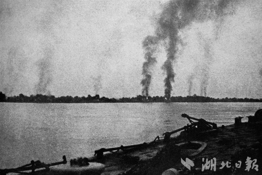 1938年10月,侵华日军随军记者从武昌江边拍摄被火焚烧的汉口城区。【图片由湖北日报全媒记者何宇欣扫描自日本于昭和十三年(1938年)十一月二十日印刷的世界画报】