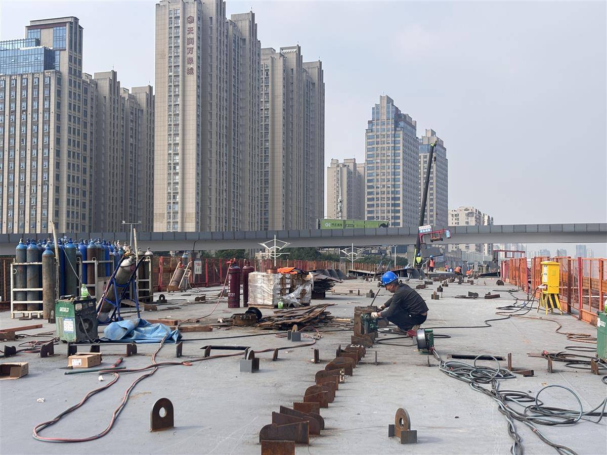 施工现场一派繁忙景象,工人们正在焊接主线桥钢箱梁。汉阳市政邓城大道光彩立交项目生产经理胡朝芳介绍,目前匝道桥和主线桥已完成全线贯通,项目形象进度达70%。