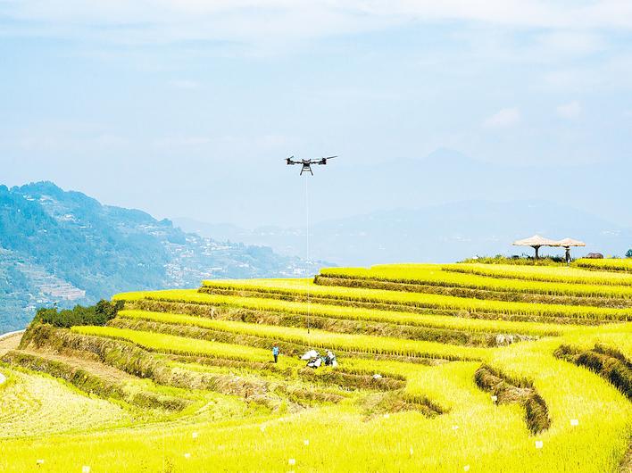 秭归县沙镇溪镇长春村,农户使用无人机吊运采收的冷水稻。(视界网 周仕伟 摄)