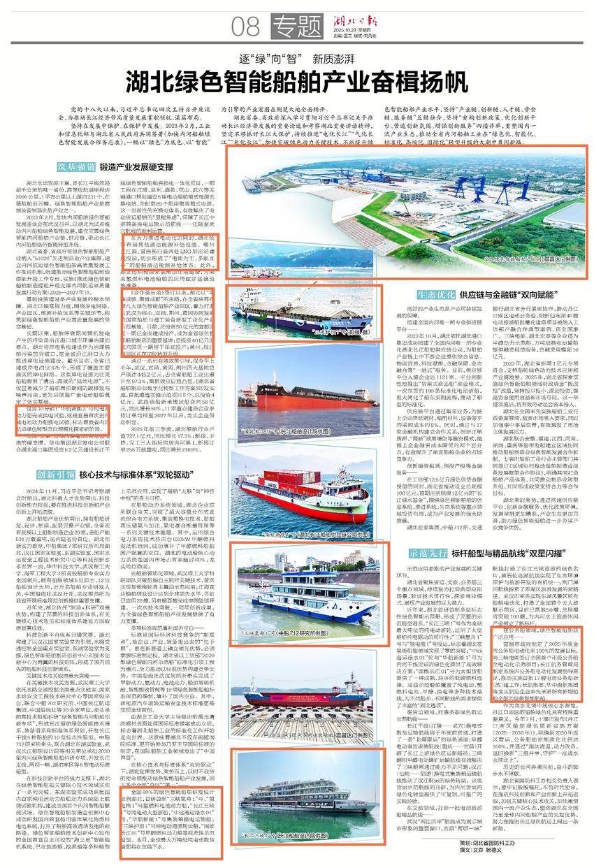 全国80%的绿色智能船舶研发设计出自湖北,首研首制“三峡氢舟1”号、“氢电拖1”号氢燃料电池动力船,“长江三峡1”号纯电动大型游船,“中远海运绿水01”轮、“华航新能1”号集装箱换电运输船,“三峡护坝1”号纯电动清漂转运船,“国能长江01”号甲醇燃料动力船等标志性示范船型。本月,全球最大万吨级纯电动散货船即将在宜昌下水。