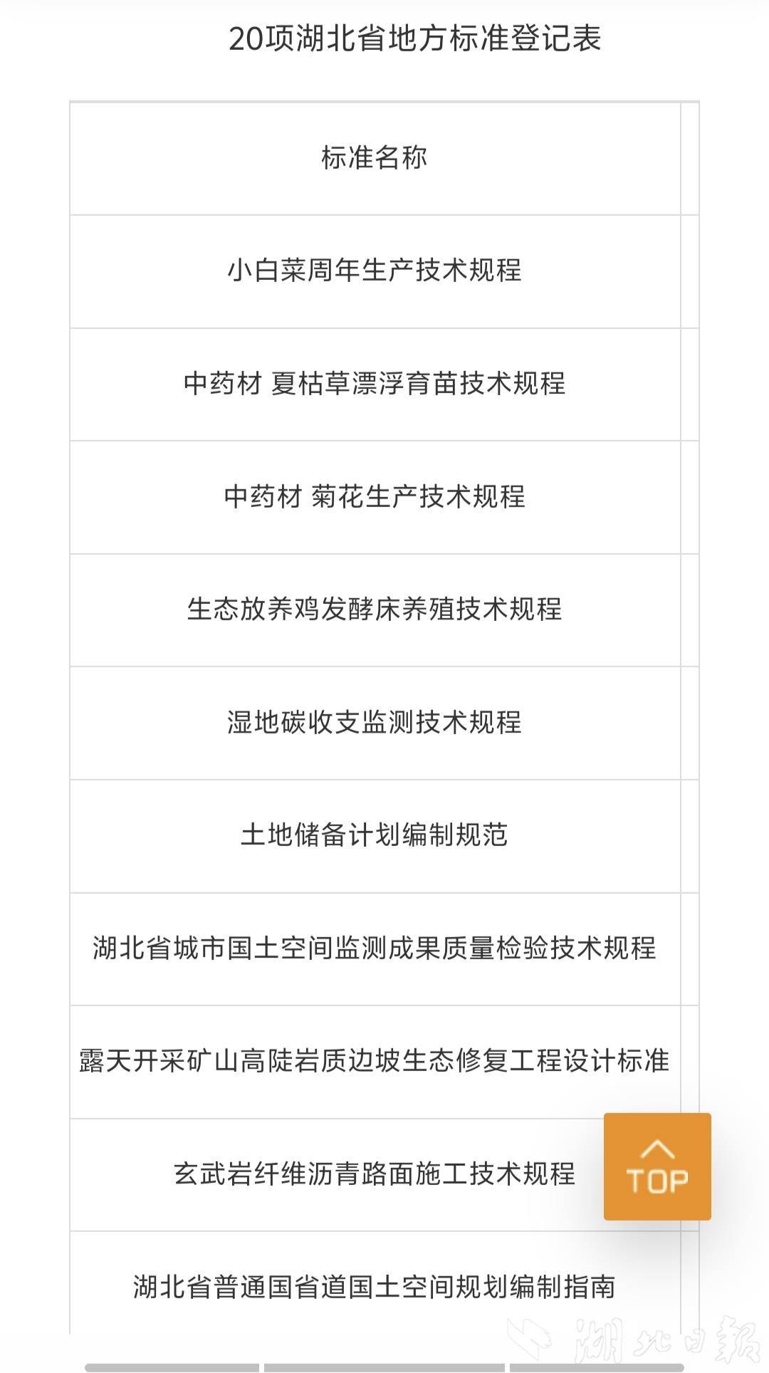 湖北日报讯(记者汪子轶、通讯员钱慧玲)10月22日从省市场监管局获悉,该局根据《湖北省地方标准管理办法》,批准《小白菜周年生产技术规程》《中药材 蕲艾种苗繁育技术规程》《电动汽车充电站计量性能在线监测设施技术规范》等20项湖北省地方标准,并予以发布。