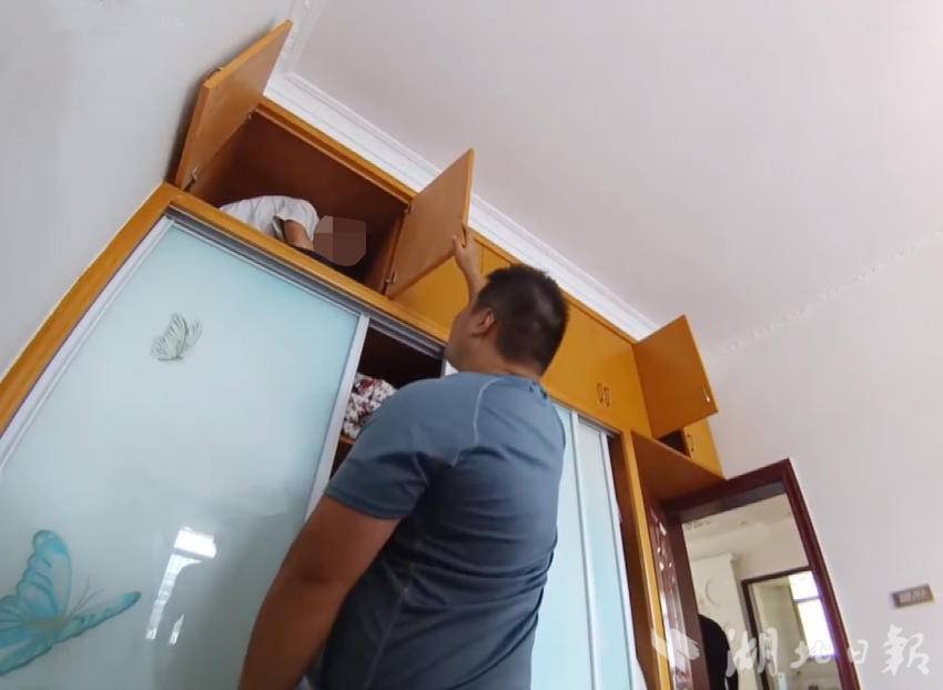 在村委会干部和见证人的陪同下,民警依法对周某住宅实施搜查。主屋、厨房、杂物间逐一搜查无果后,民警将注意力转向偏僻的客卧。该房间长期闲置,布满灰尘,但柜门有轻微挪动痕迹。民警打开衣柜,发现顶部夹层有异常凸起,掀开木板后,一个蜷缩的身影赫然出现在眼前——正是嫌疑人周某。