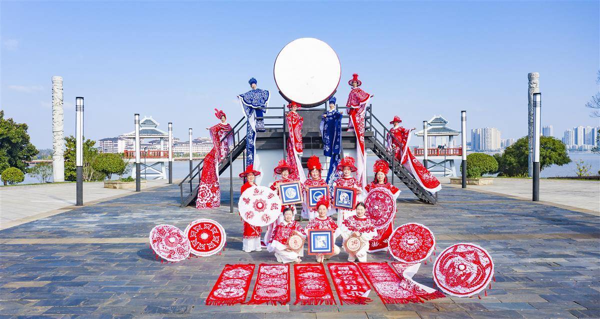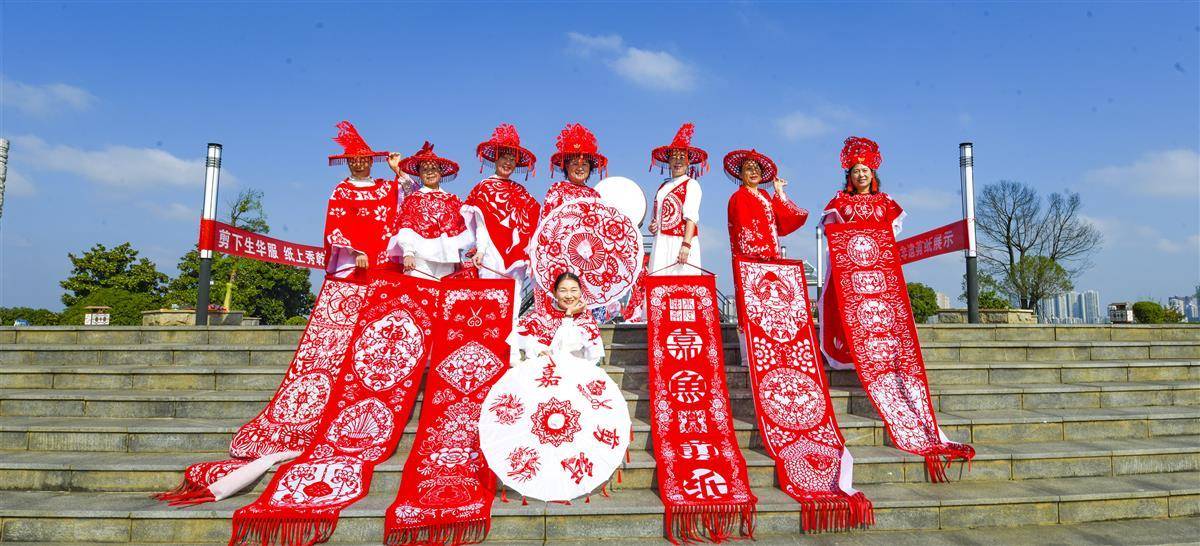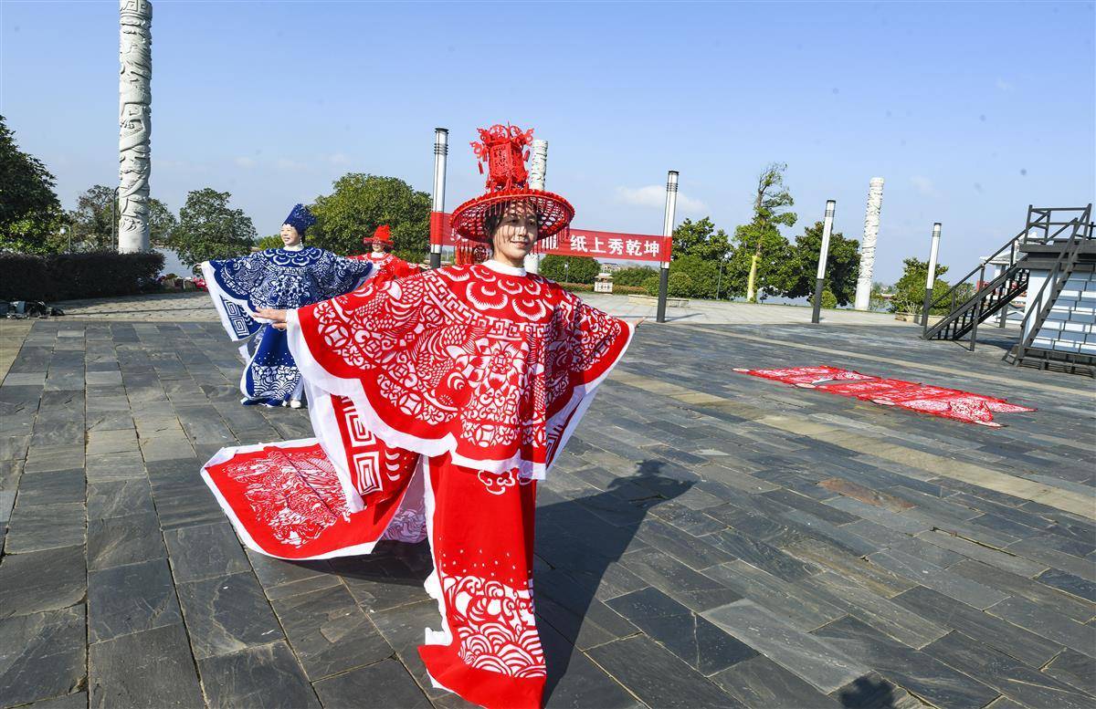 10月22日上午,嘉鱼县二乔环湖公园广场,嘉鱼县“艺剪中心”八位非遗剪纸传承人、身着剪纸华服的模特,在雄风台以一场别开生面的“剪纸时装秀”,让剪纸艺术从平面走向立体,从展柜走上舞台,为重阳佳节注入传统与现代交融的文化新意。(湖北日报农村版通讯员 雷平 庞建琴 摄)