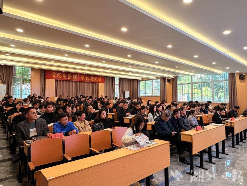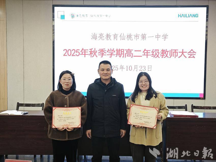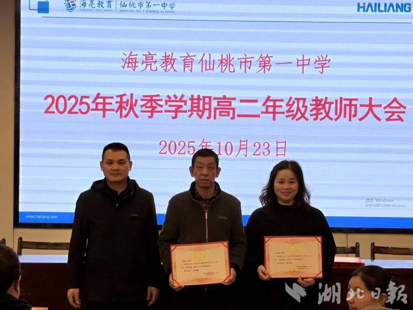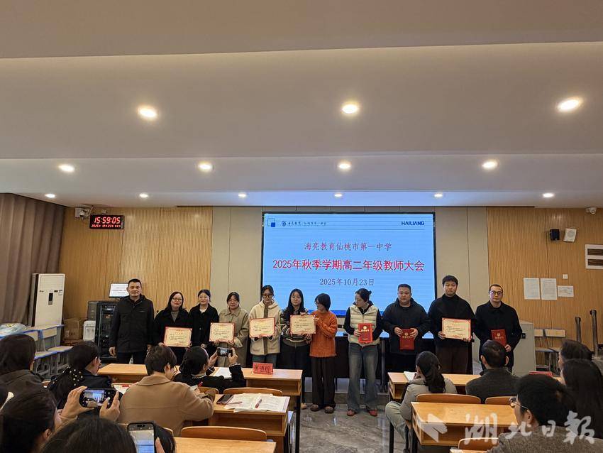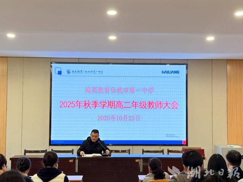 湖北日报客户端讯(通讯员陈雄、张帅)10月23日下午,仙桃一中高二年级在阶梯教室召开2025年秋季学期全体教师大会。会议由高中部副校长兼高二年级主任马洪泉主持。本次大会旨在总结前期成绩、表彰优秀教师,并部署近期重点工作,为提升教育教学质量凝聚共识。
