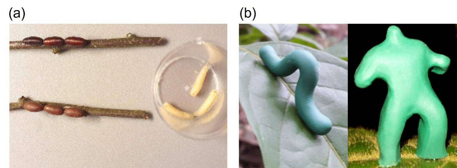 以往研究表明橡皮泥模型法可能存在局限性。a. Zvereva等(2022)发现橡皮泥模型(左下)上动物痕迹的类别和时间格局与真实的蛆虫(右)和虫蛹(左上)存在较大差异。b. Weissflog等(2022)发现绿色毛虫模型和绿巨人模型被动物攻击的概率没有差别。(武汉植物园提供)