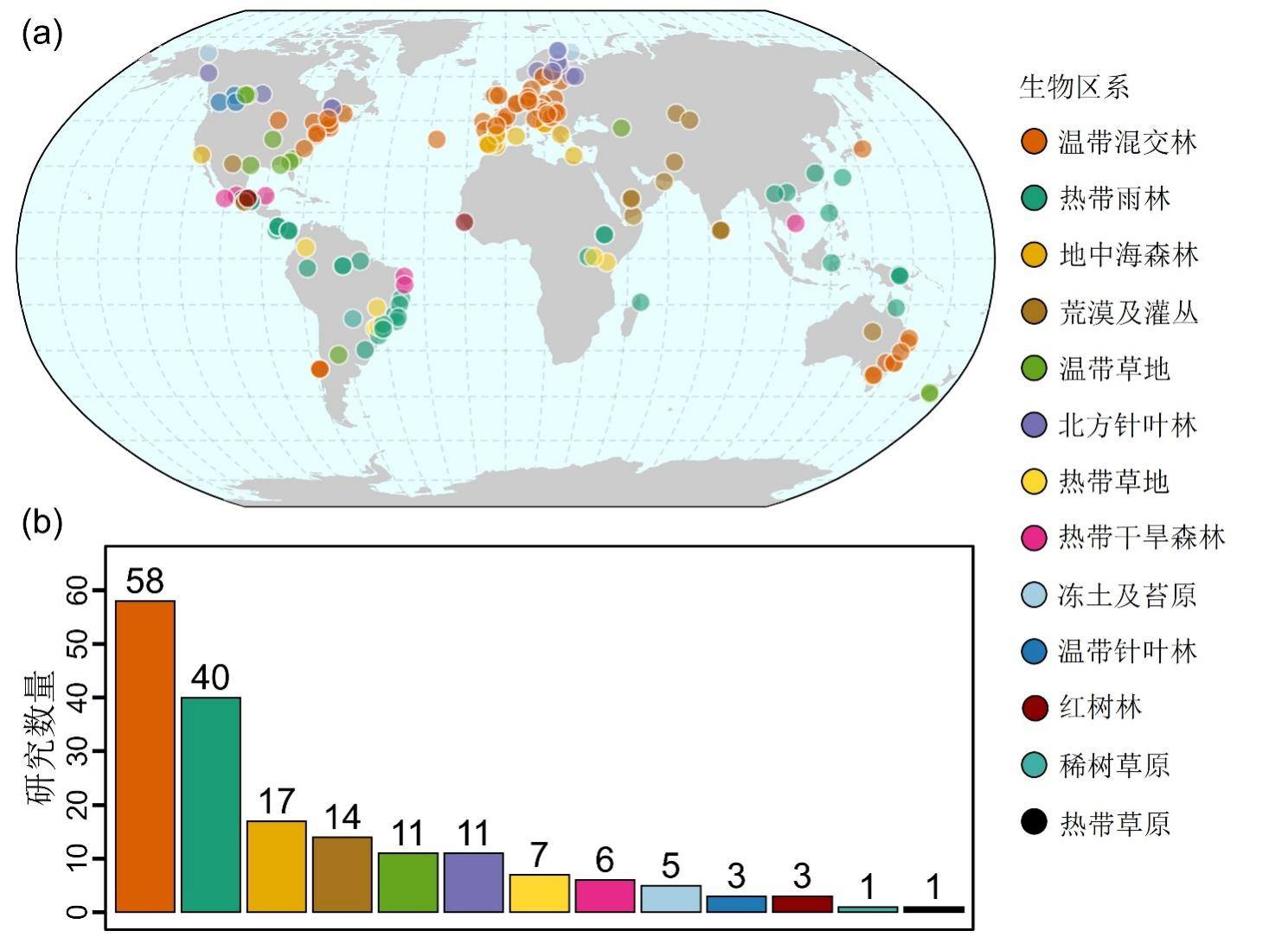 橡皮泥模型被广泛应用于全球不同生物区系。a.以往研究的地理分布及对应生物区系;b.不同生物区系的研究数量。