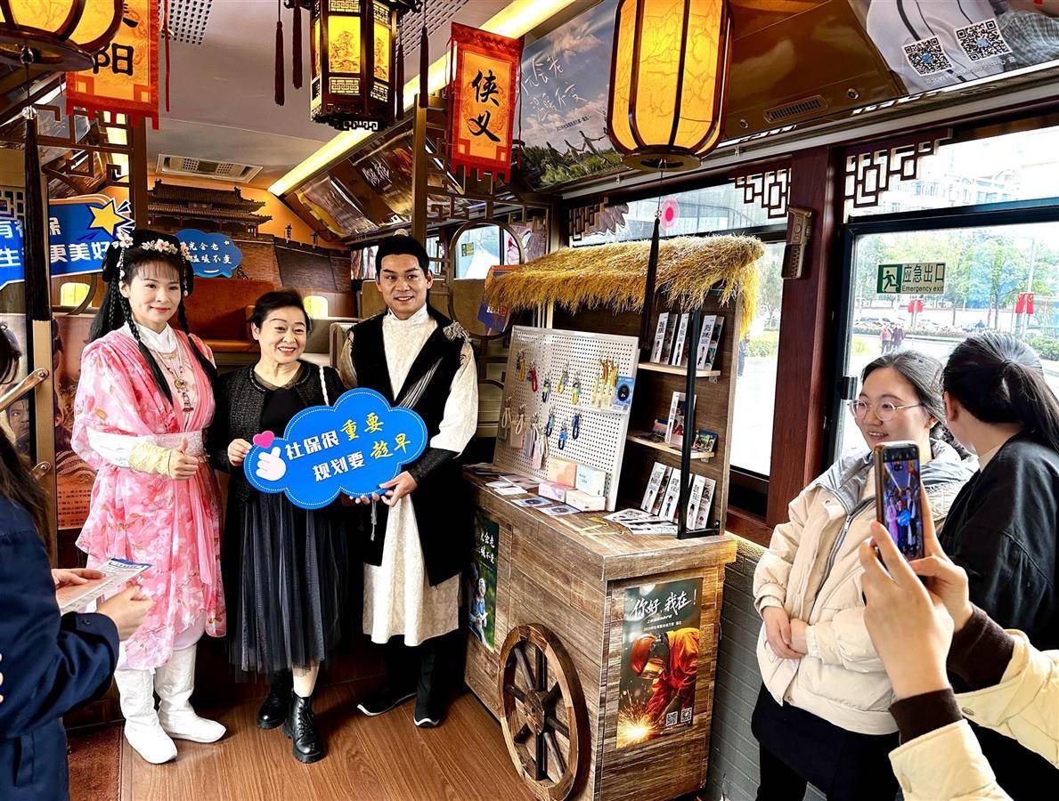 湖北日报全媒记者走进“侠义主题公交”改造的“社保客厅”,毕业求职、返乡创业、社保政策等宣传资料有序摆放,“郭靖”“黄蓉”变身社保宣传员与市民互动交流。一旁的社保规划师正为灵活就业人员答疑解惑,量身定制参保方案。