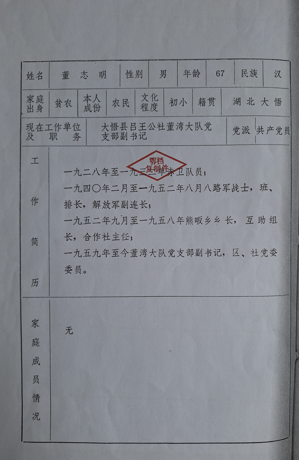 档案资料清晰地显示,董志明1928年成为赤卫队队员;1940年2月至1952年8月为八路军战士,担任班、排长,解放军副队长,荣立三等功两次、四等功三次。1952年复员返乡后,他深藏功名默默奉献,担任过乡长、合作社主任、大队党支部副书记等职务,于1977年12月当选为湖北省第五届人大代表。“看着这些珍贵的档案,一个勇敢善战、默默奉献的爷爷就在眼前。”董征武与李佳热泪盈眶,指尖抚过档案的瞬间,仿佛触碰到了先辈滚烫的战斗轨迹。