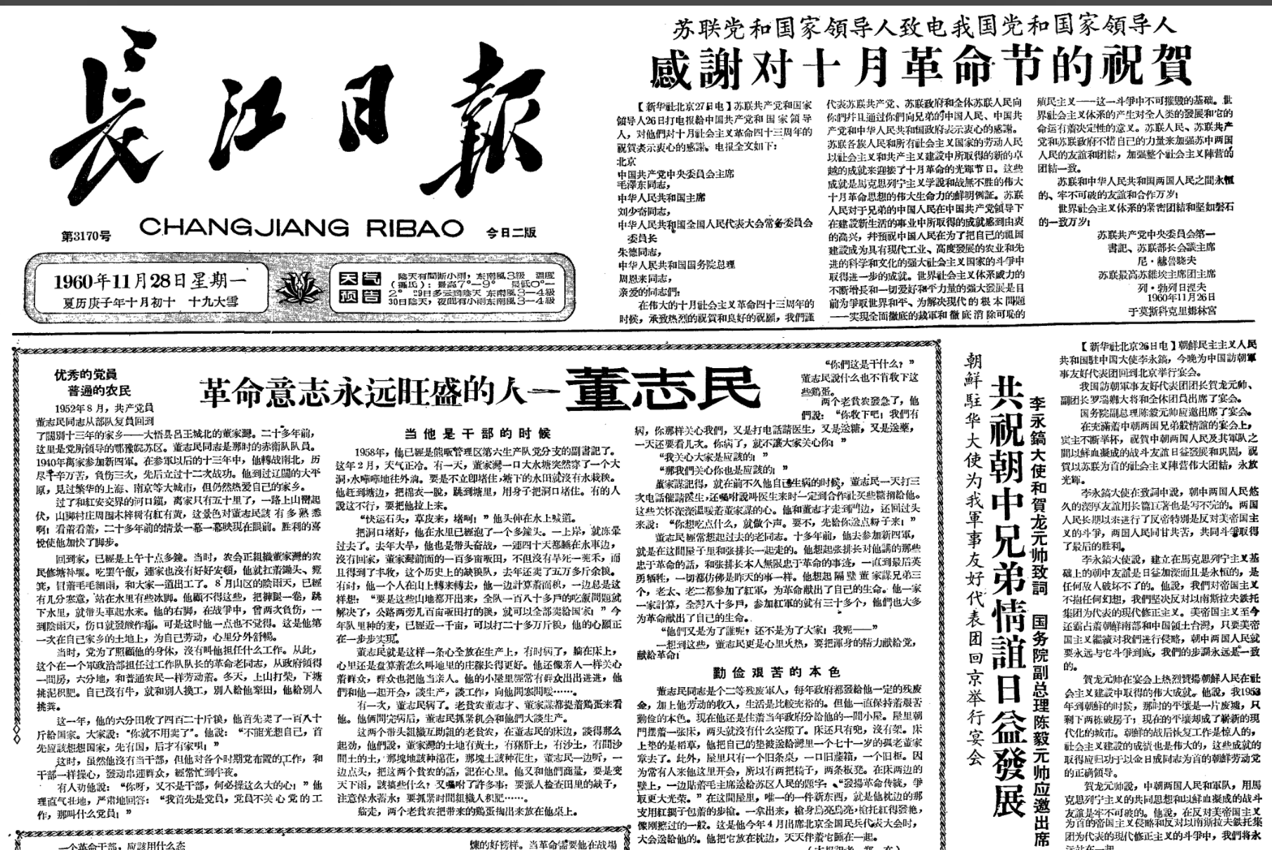 长江日报记者也为董征武找到了一份1960年11月28日的《长江日报》,让英雄形象愈发鲜活。报纸在头版刊登的题为《革命意志永远旺盛的人——董志民》的文章写道:“二十多年前,这里是党所领导的鄂豫皖苏区。董志民同志是那时的赤卫队队员。1940年离家参加新四军。在参军以后的十三年中,他转战南北,历尽千辛万苦,负伤三次。他到过辽阔的大平原,见过繁华的上海、南京等大城市,但仍然热爱自己的家乡。”这些文字,让未谋面的后人与先辈的热血重逢。