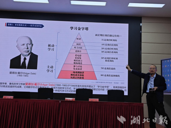 接着,肖新国院长给现场的老师们带来了《我市英语教学之我见》的专题讲座。肖院长结合案例,谈论了自己研究总结的课堂教学模式。并结合学习金字塔,要求老师们以学习为中心去转变自己教学的方式,以学生为主体去转变学习的方式以及以教学评价流程来调整教学结构。他希望老师们用工具创造出奇迹,让学生们动起来,让课堂活起来。肖院长深入浅出地分享,让老师们受益匪浅。