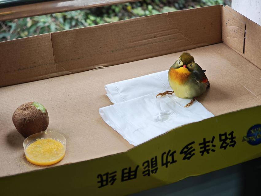 都镇湾镇相关工作人员迅速赶赴现场。经辨认,该鸟为国家二级保护动物——红嘴相思鸟。其右眼受伤,初步判断为撞击或争斗所致,因无法正常觅食导致身体虚弱。工作人员随即开展专业救护,为其补充营养并实施照料。经救助,该鸟身体状况明显好转能够主动进食和短距离飞行。