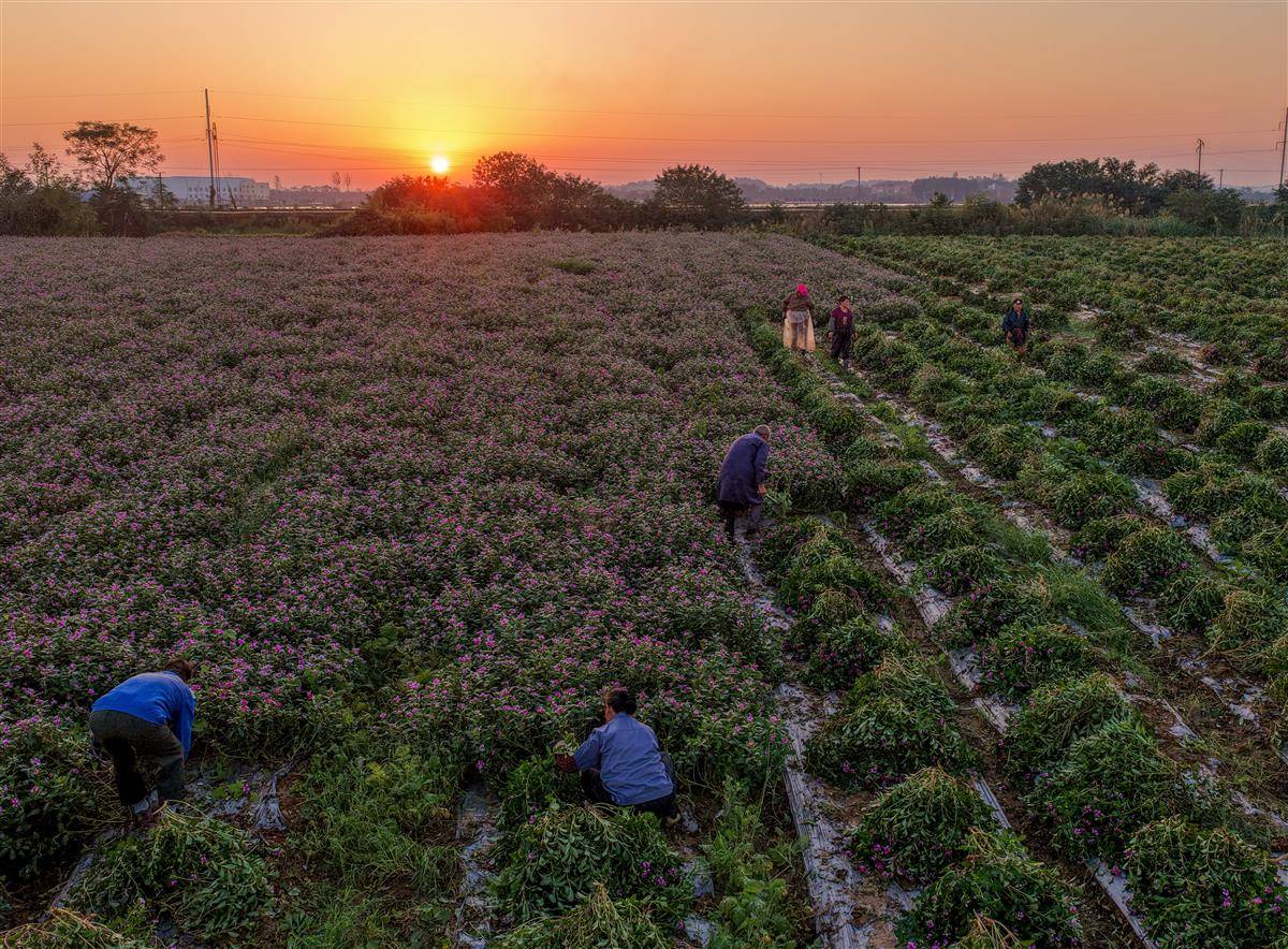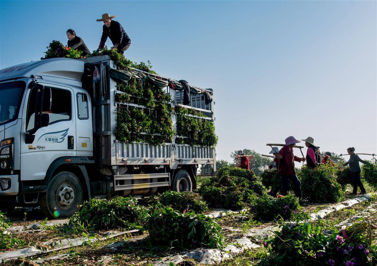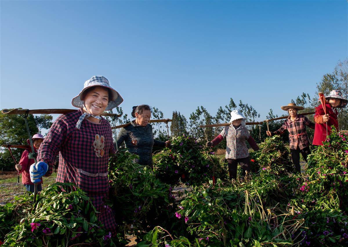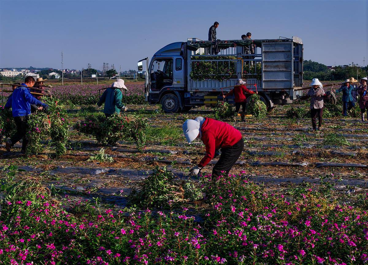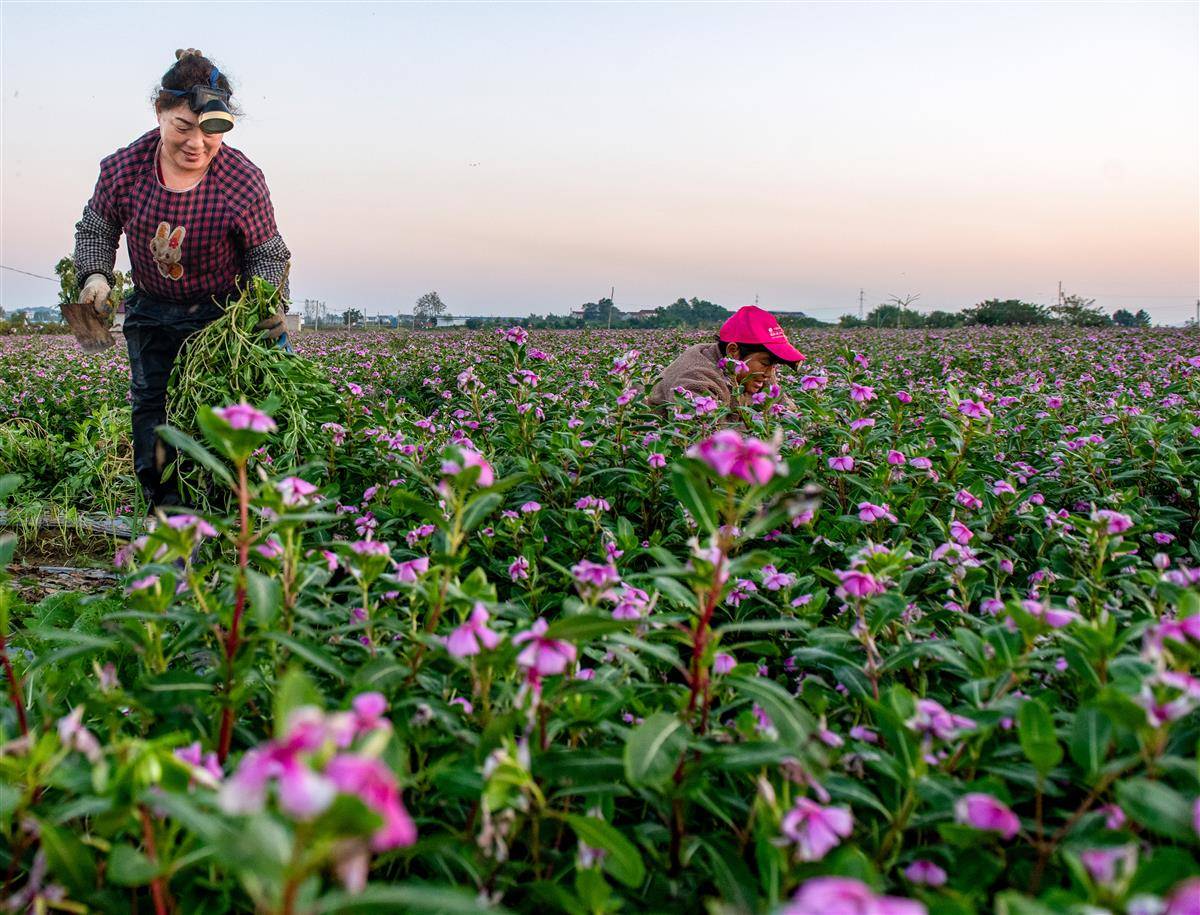 10月23日清晨,黄冈市蕲春县八里湖办事处三线垸的长春花种植基地里,60多名村民迎着朝阳在花田里收割、扎捆,抢晴天把长春花运往制药企业。今年,八里湖办事处在三线垸、白堰等地种植的200亩长春花获得丰收,带动了60多名村民在家门口就业,人均增收超3000余元。