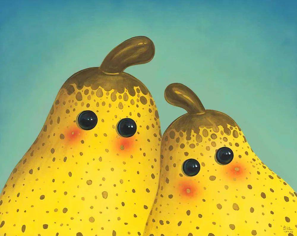 多巴胺色彩近年来风靡社会,以其鲜艳、明亮的色调带来视觉和情感上的愉悦。《永不分梨》是山东籍当代潮流艺术家张超级以水果为载体创作的布面丙烯系列作品。该系列通过梨、火龙果等水果意象传递温暖治愈的情感,践行艺术家”食物总能带给人慰藉和安全感”的创作理念。作品运用非凡洋红与嫩绿色形成强烈视觉对比,具有鲜明的潮流艺术特征,其IP形象已被国内外艺术机构收藏。